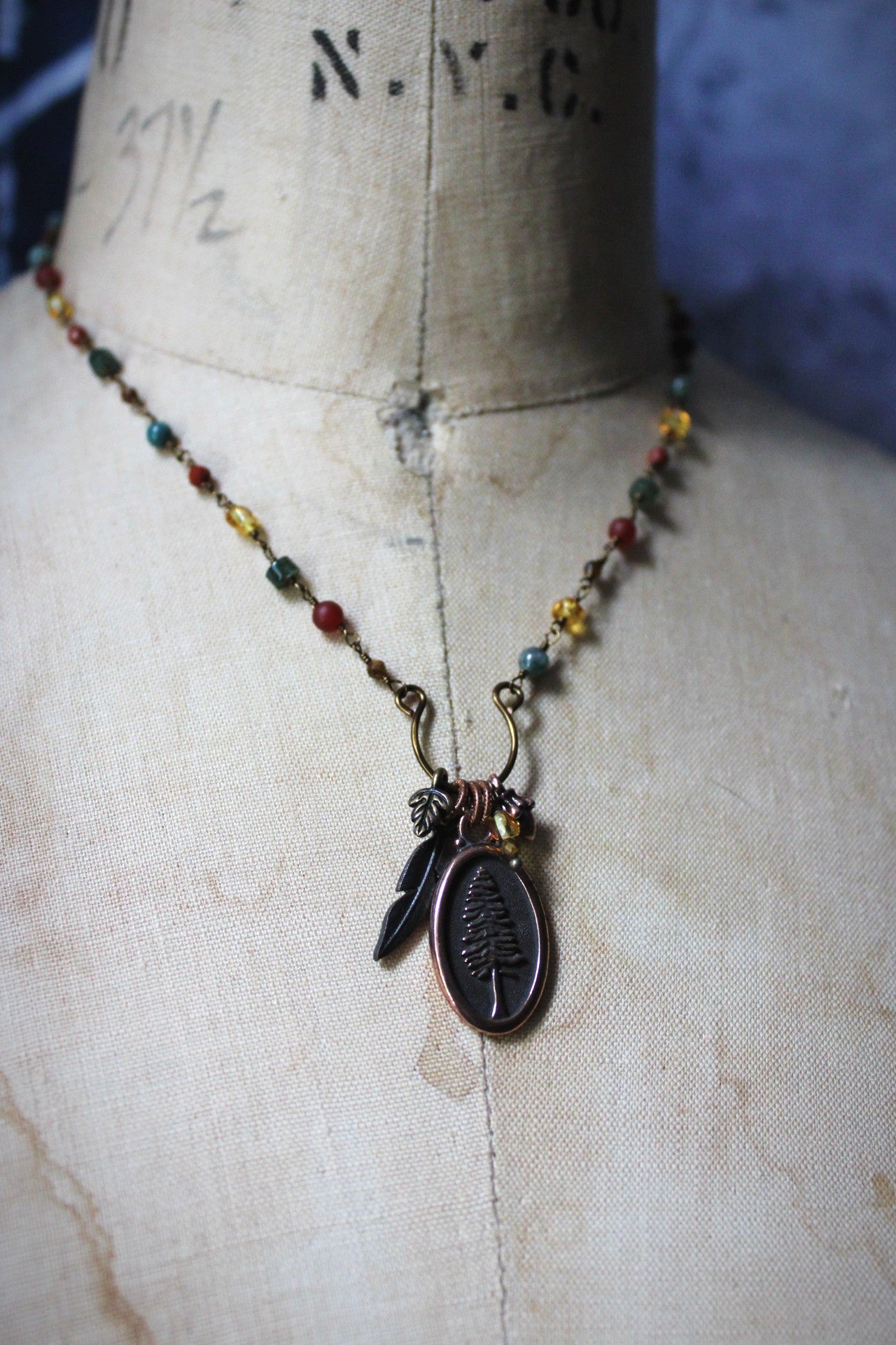 • antiqued brass hand-wiring, accents (feather + leaf) & clasp