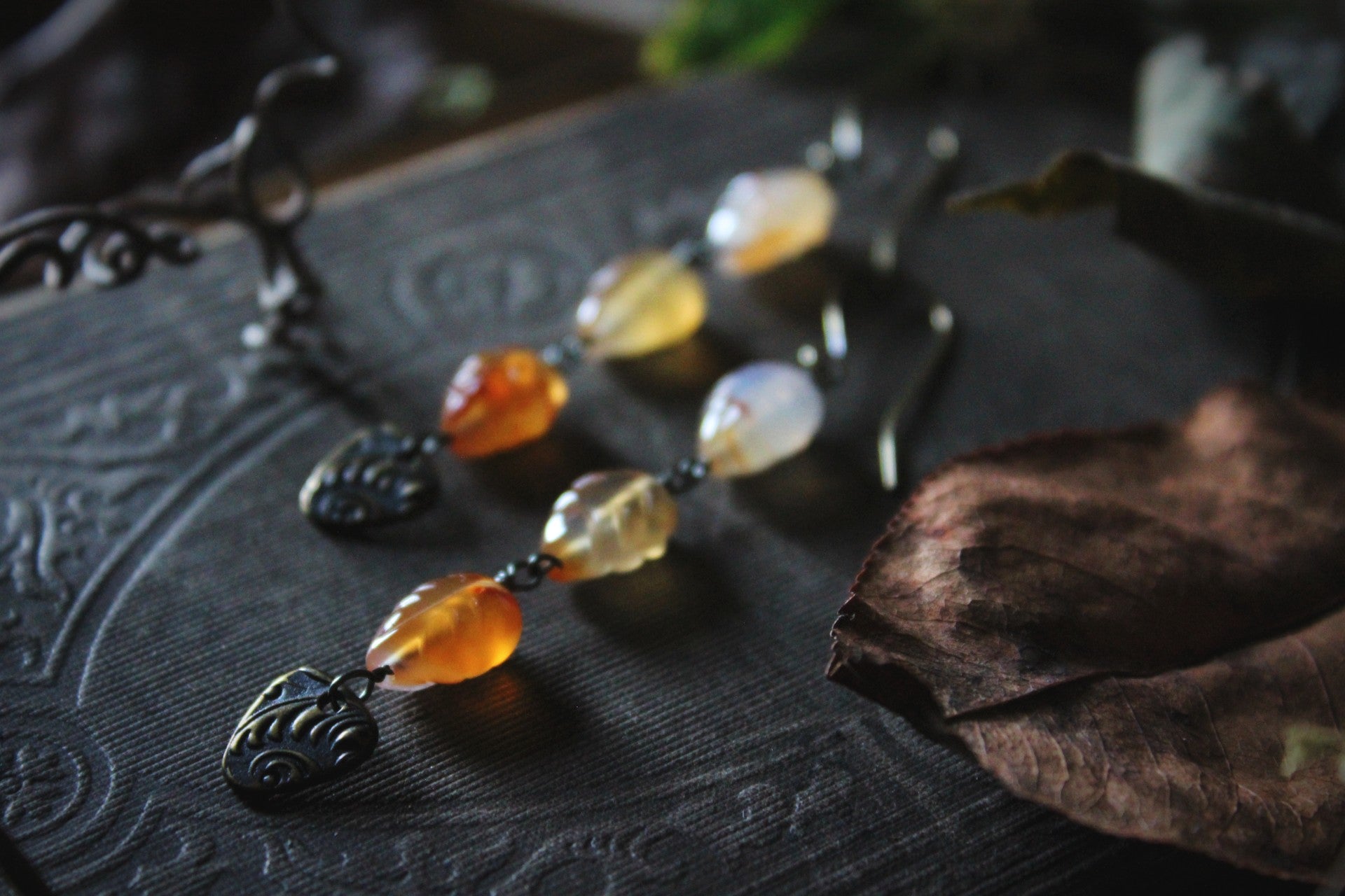 - antiqued brass finish hand-wiring, botanical filigree drops & ear wires