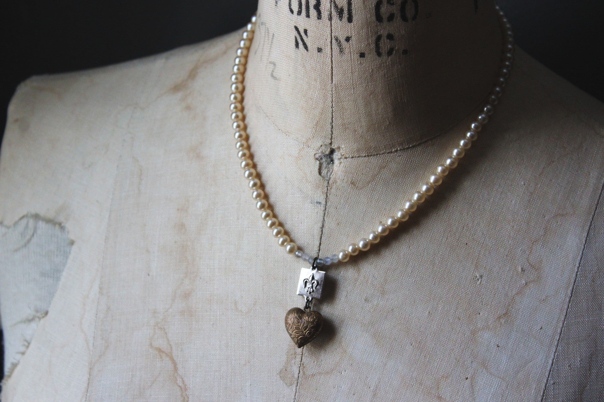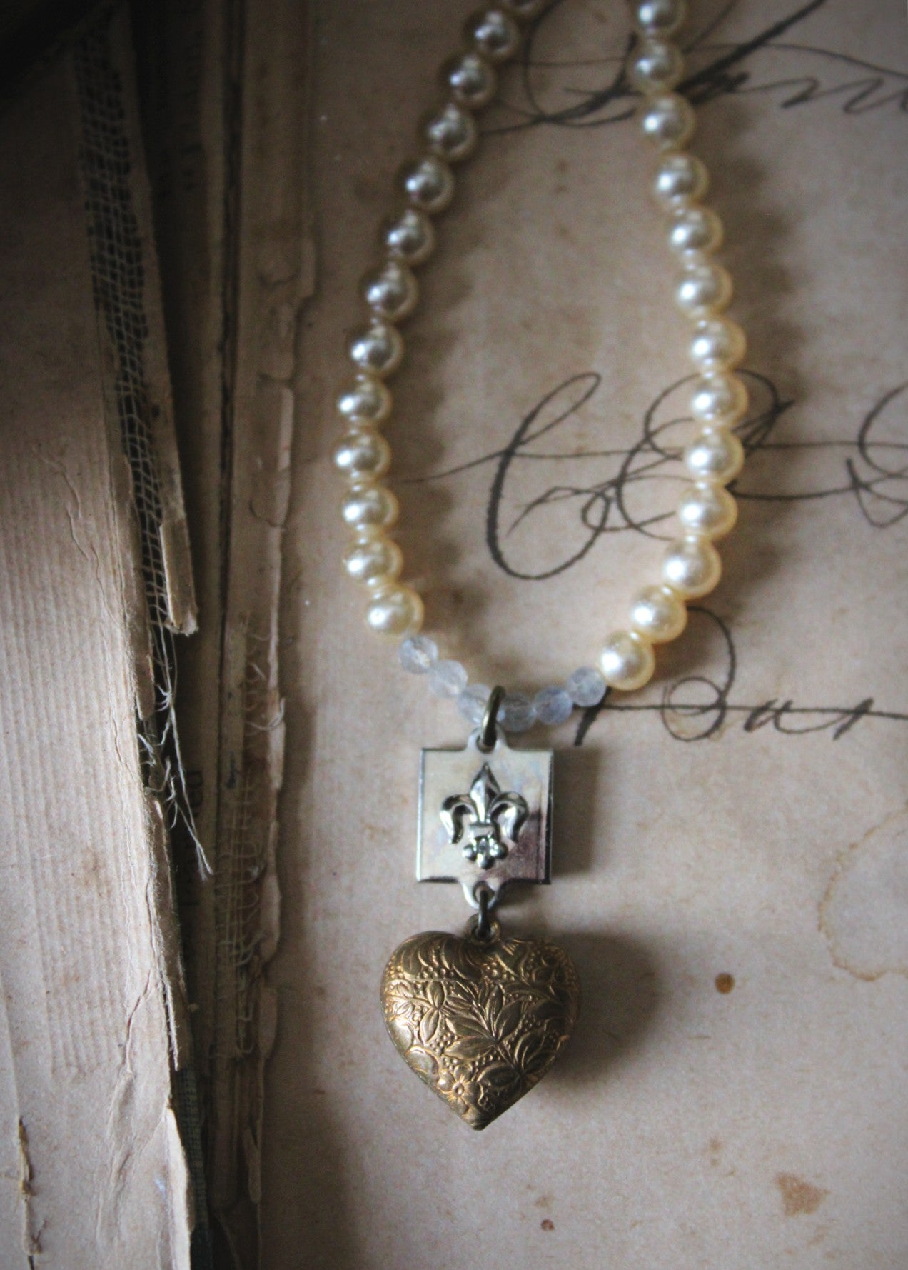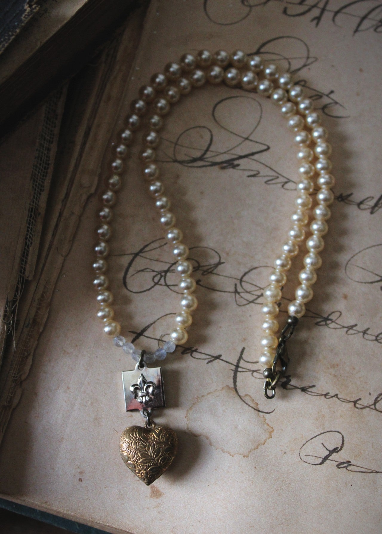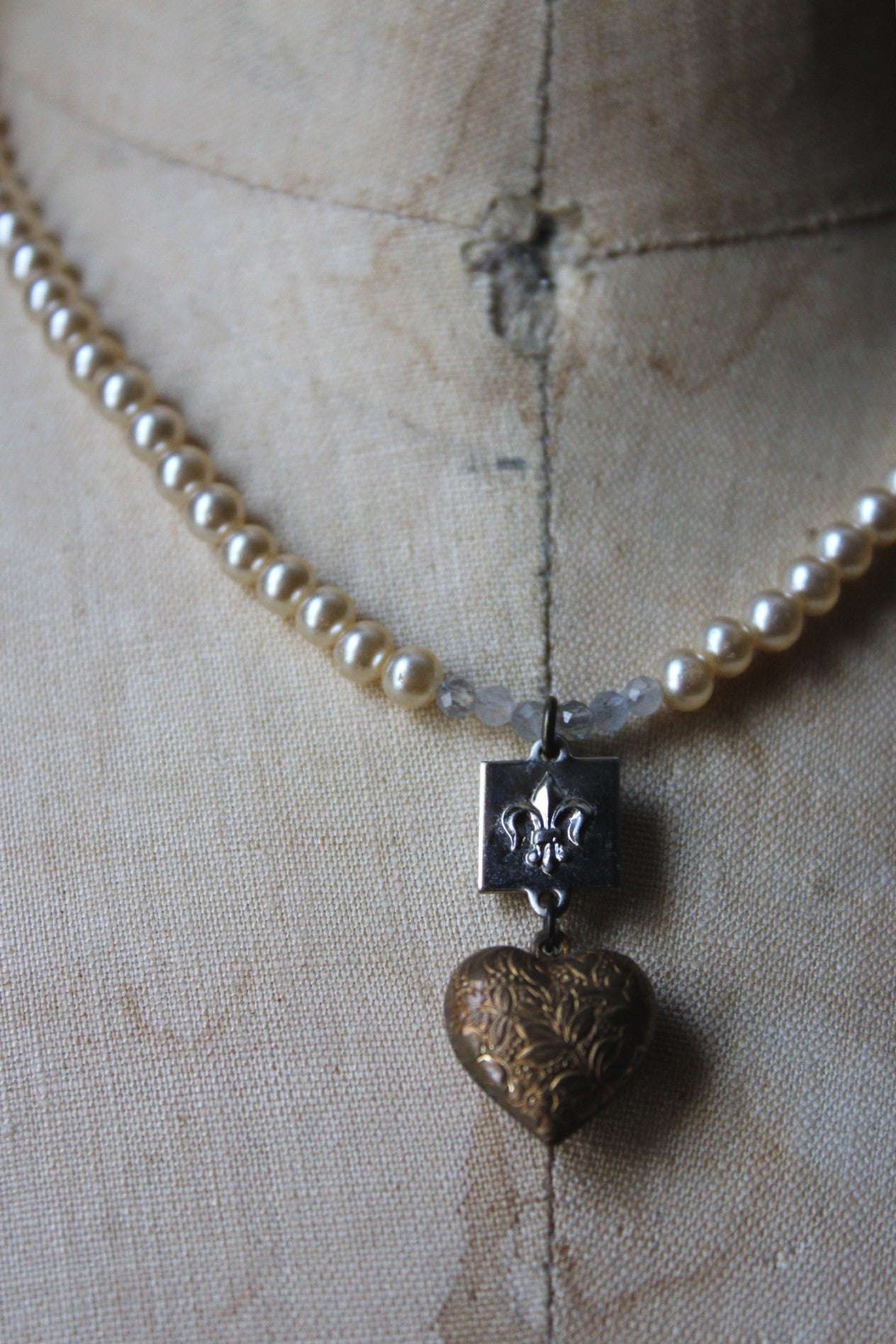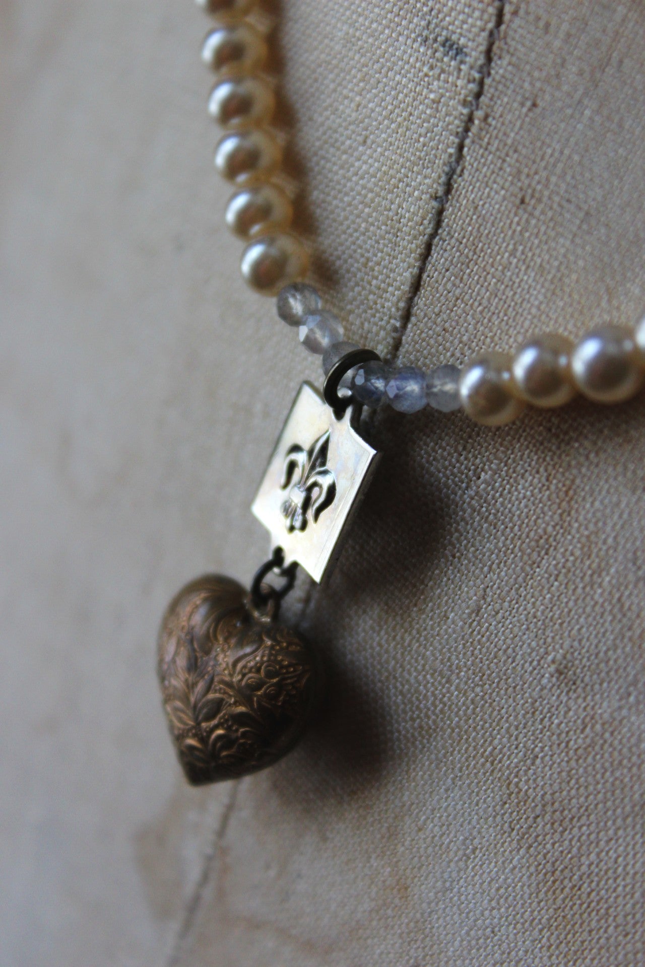 Hand-strung, vintage faux pearls surround faceted Labradorite accents and a one-of-a-kind, vintage pendant of a fleur de lis link and puffed floral heart.