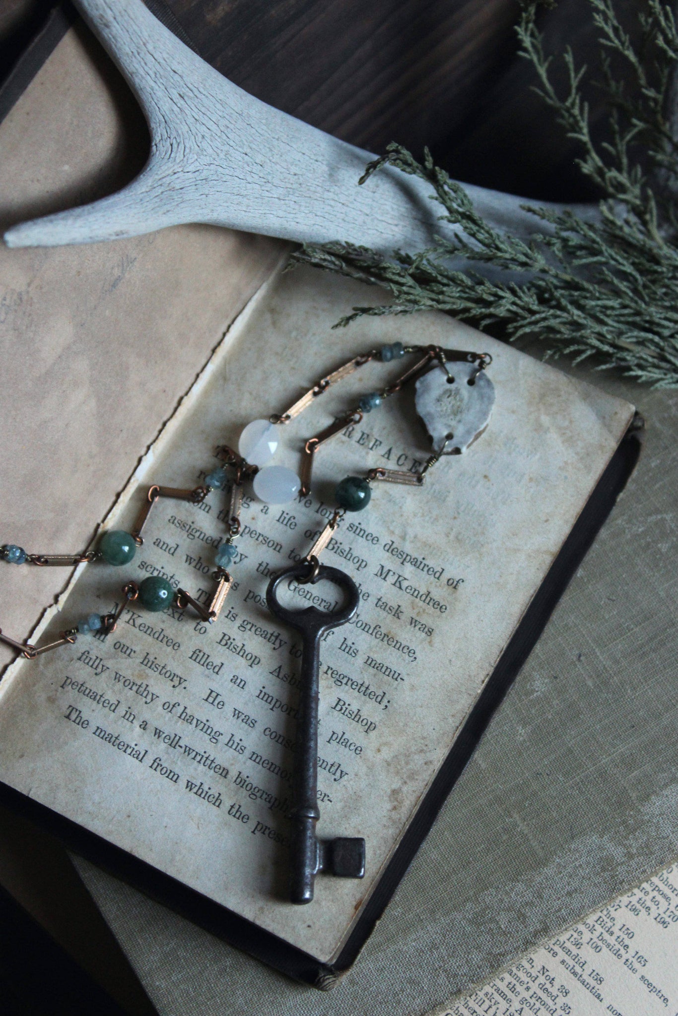 The Bindwood Stag Lodge. Storyteller Series. Skeleton Key, Antler and Gemstone Rosary Style Necklace.